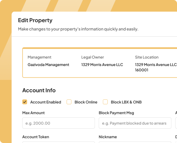 Easily set payment acceptance rules & business configurations for your entire portfolio, a building or even a unit, decreasing manual intervention.